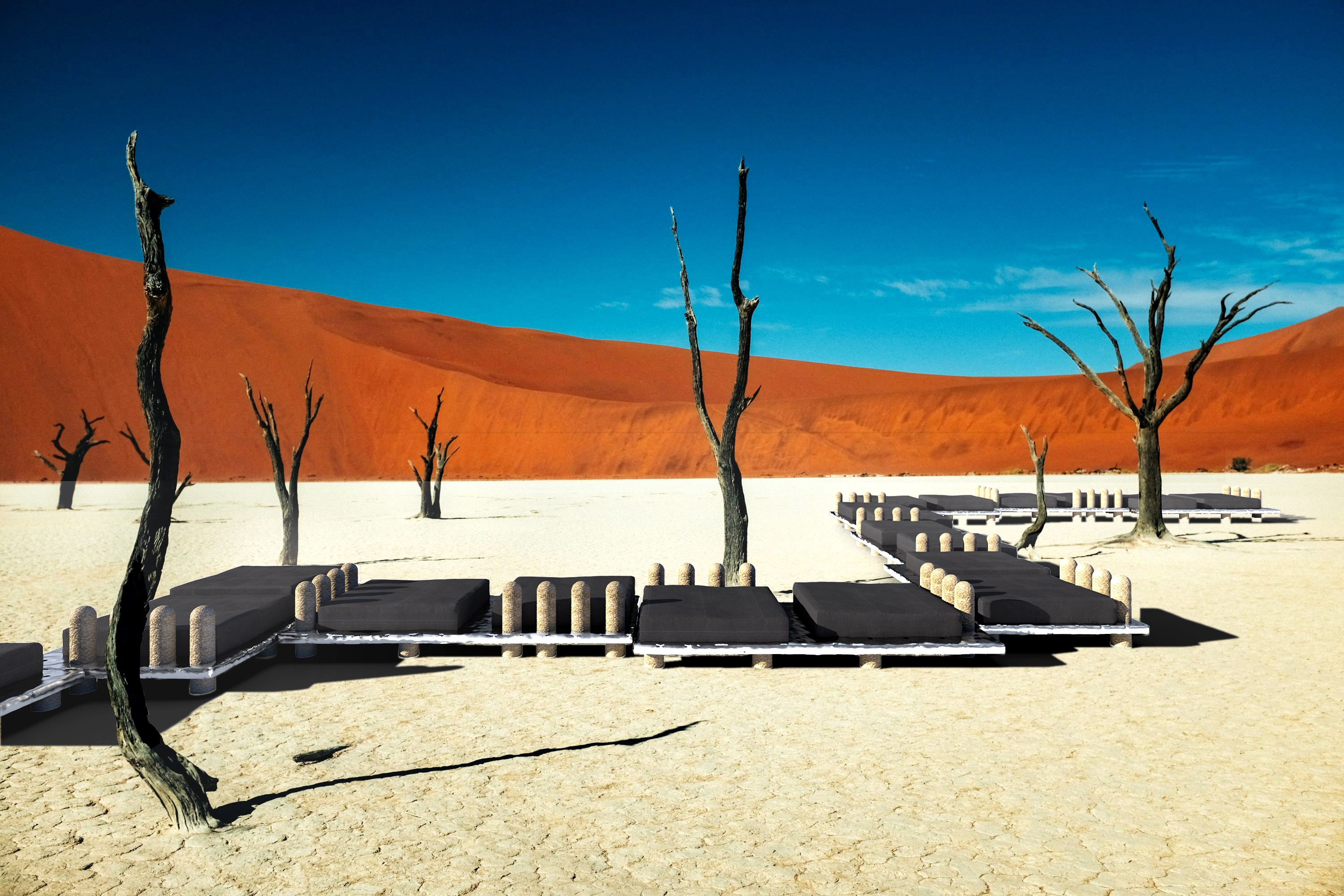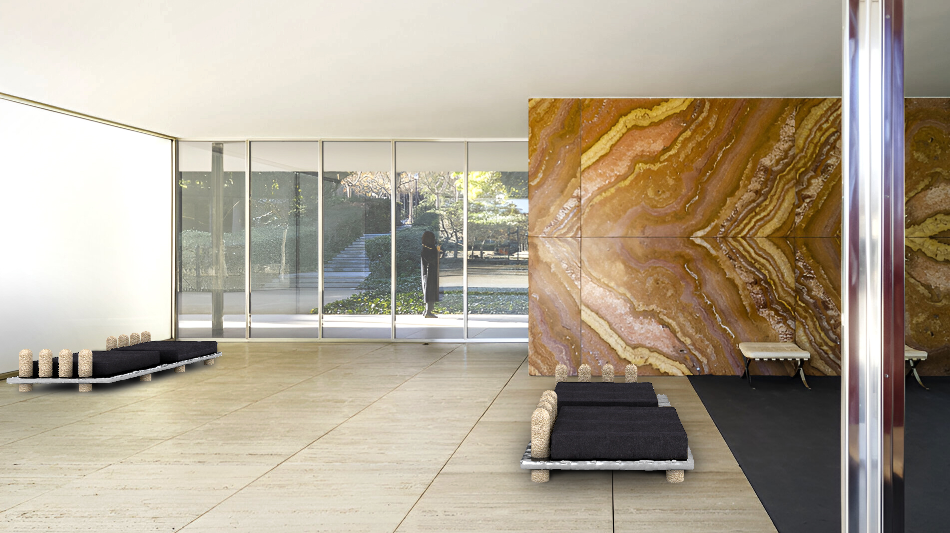 A grid is superimposed onto a poured platform of recycled aluminum, forming a sculpted landscape. Cushions in standardized sizes are placed atop the irregular, sand-cast surface, while the wooden feet snap precisely into the grid. The result is a flexible system that can take on multiple configurations and exist in various sizes, according to individual needs. Combined, the daybeds can form a landscape of their own.