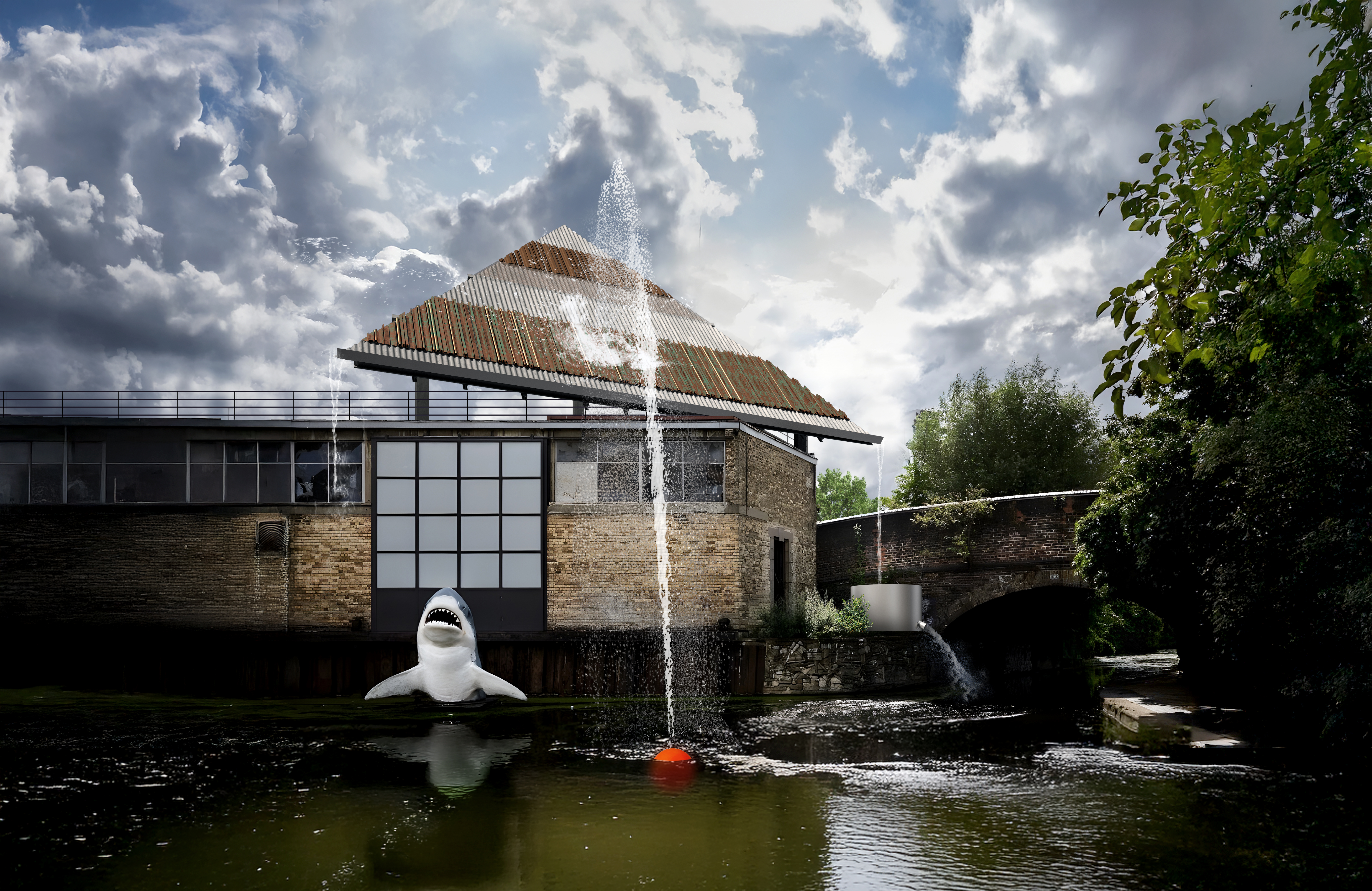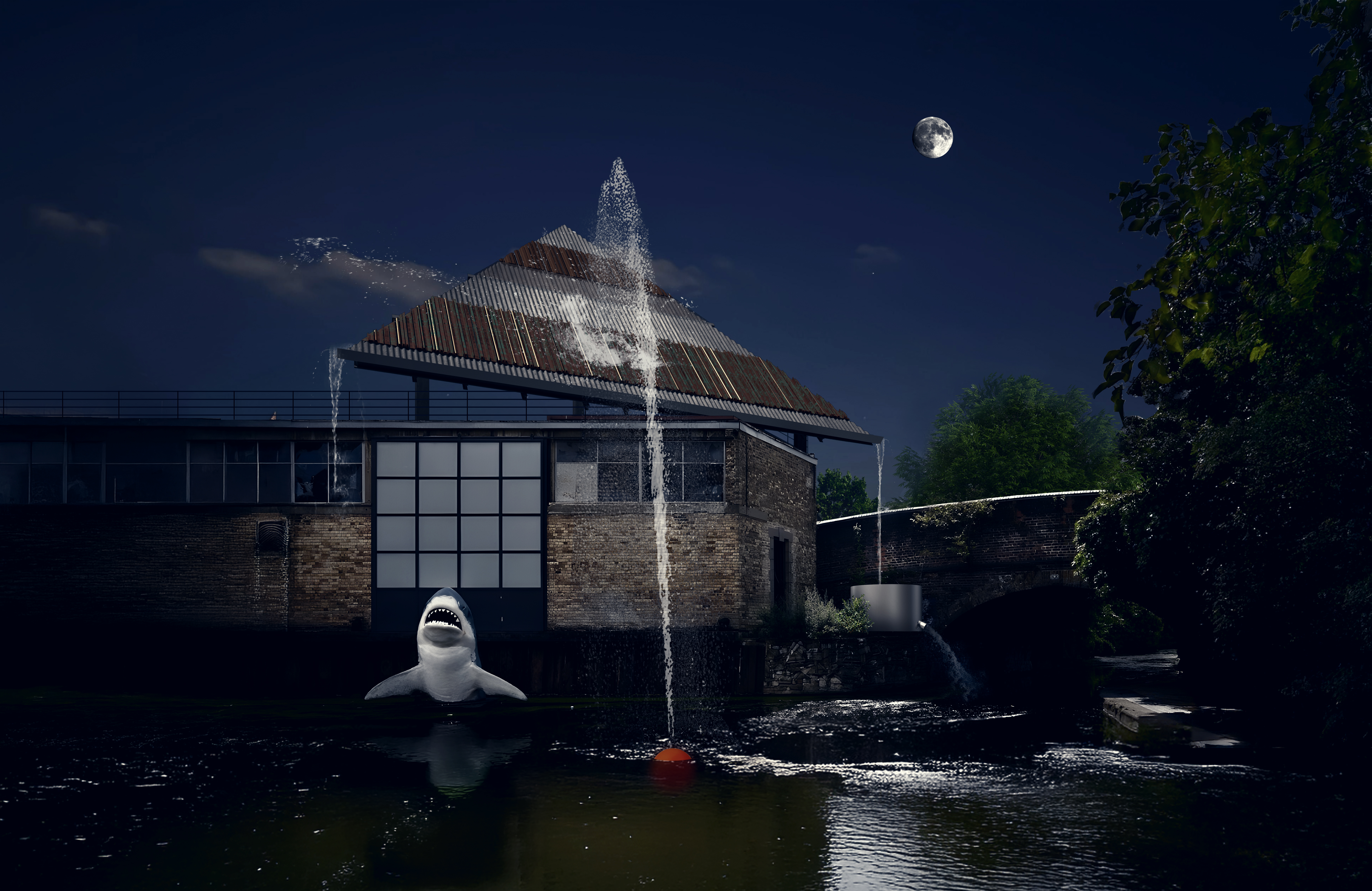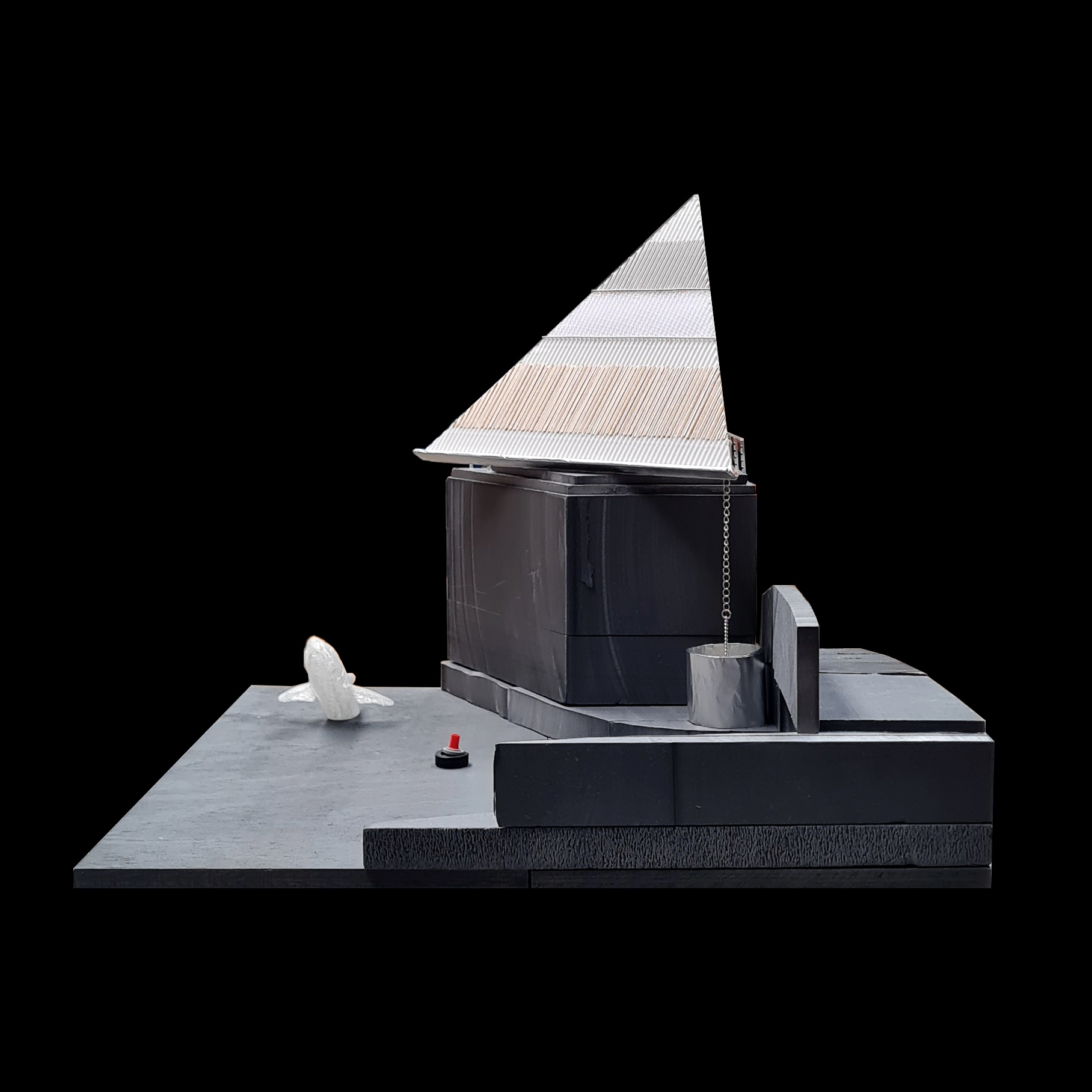 At the heart of the piece is a water jet that bursts unexpectedly from the canal once every hour. The stream strikes a sharply defined, triangular roof—an architectural form that serves both as a visual anchor and a symbolic peak. This roof is adorned with fragments salvaged from previous pavilions, embedding the installation with a visible lineage of past interventions.